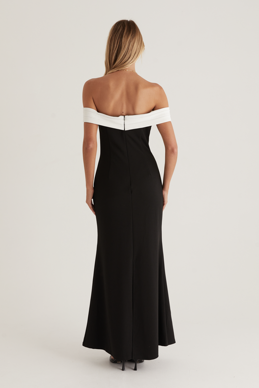 Georgina Maxi Dress Black with White Bardot Neckline
