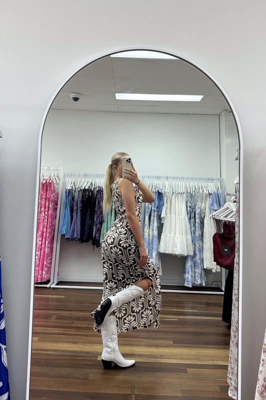 Jemma Deep V Neck Midi Dress Geometric Print Black and White