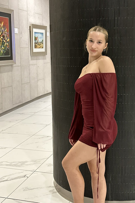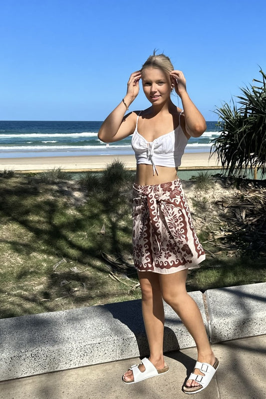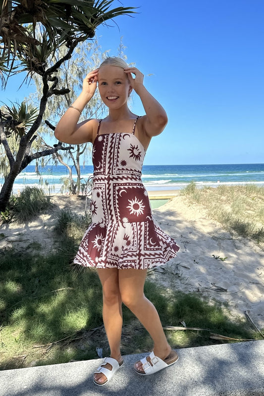 Stephanie Print Mini Dress Tie Waist Brown/Creme